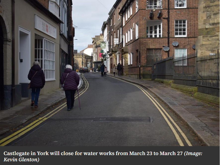 🚧 Castlegate Closes Today — Plan Your Route Now Castlegate shuts from 8am this morning until 5pm on Friday 27 March for water supply works. The closure runs between the junction with Friargate and number 28 Castlegate — the stretch passing Fairfax House and St Mary's Church near the Castle car park. No diversion signs are in place, so plan ahead if you're driving into that part of the city centre this week. (Source: Gazette & Herald)