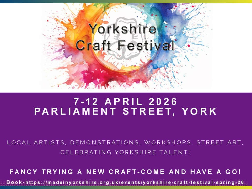 🧶 Yorkshire Craft Festival comes to Parliament Street - 7–12 April Made in Yorkshire is bringing the Yorkshire Craft Festival back to the city from Tuesday 7 to Sunday 12 April, transforming Parliament Street into a hub of handmade creativity. Free to attend (10am–5pm daily), the six-day event features a marquee packed with local makers selling everything from homeware to traditional crafts, plus hands-on workshops covering stained glass, blacksmithing, felt-making, willow weaving and pot throwing. Children's activities were included too. A great one to pencil in. Book workshops in advance via the link.